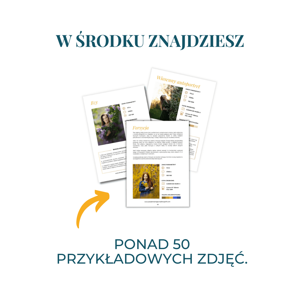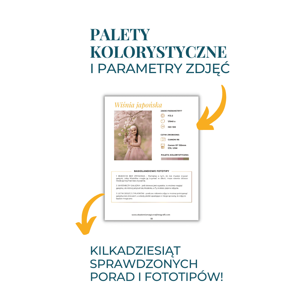 W kompleksowym poradniku: “20 pomysłów na wiosenne zdjęcia w plenerze” przeprowadzę Cię za rękę przez cały proces przygotowania siebie i modeli – pokazuję Ci konkretne palety barw, które możesz wykorzystać przy budowaniu swoich wiosennych stylizacji.