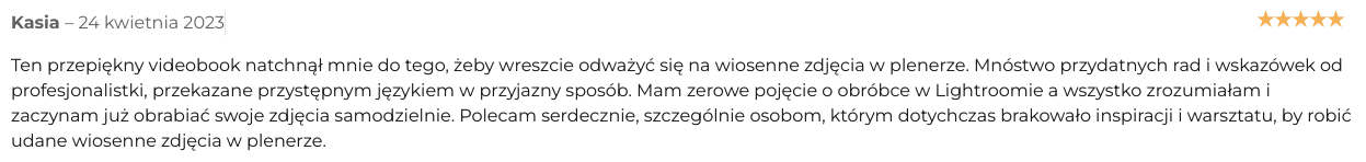 Ten przepiękny videobook natchnął mnie do tego, żeby wrzeszcie odważyć się na wiosenne zdjęcia w plenerze. Mnóstwo przydatnych rad i wskazówek od profesjonalistki, przekazane przystępnym językiem w przyjazny sposób. Mam zerowe pojęcie o obróbce w Lightromie a wszystko zrozumiałam i zaczynam już obrabiać swoje zdjęcia samodzielnie. Polecam serdecznie, szczególnie osobom, którym dotychczas brakowało inspiracji i warsztatu, by robić udane wiosenne zdjęcia w plenerze.